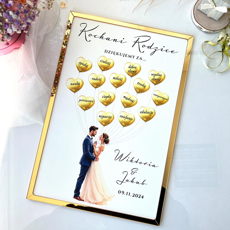 złotą lub srebrną ramką, pozwalają dopasować upominek do stylistyki wesela i preferencji