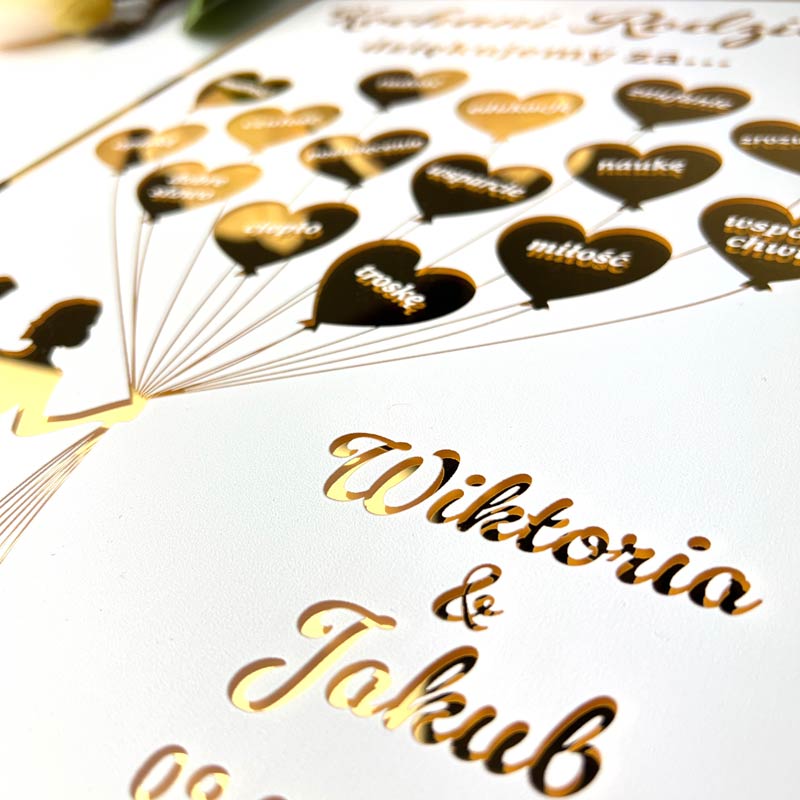 wesela - Podziękowanie ślubne z grawerowanymi napisami i wycinanymi elementami – klasyka z