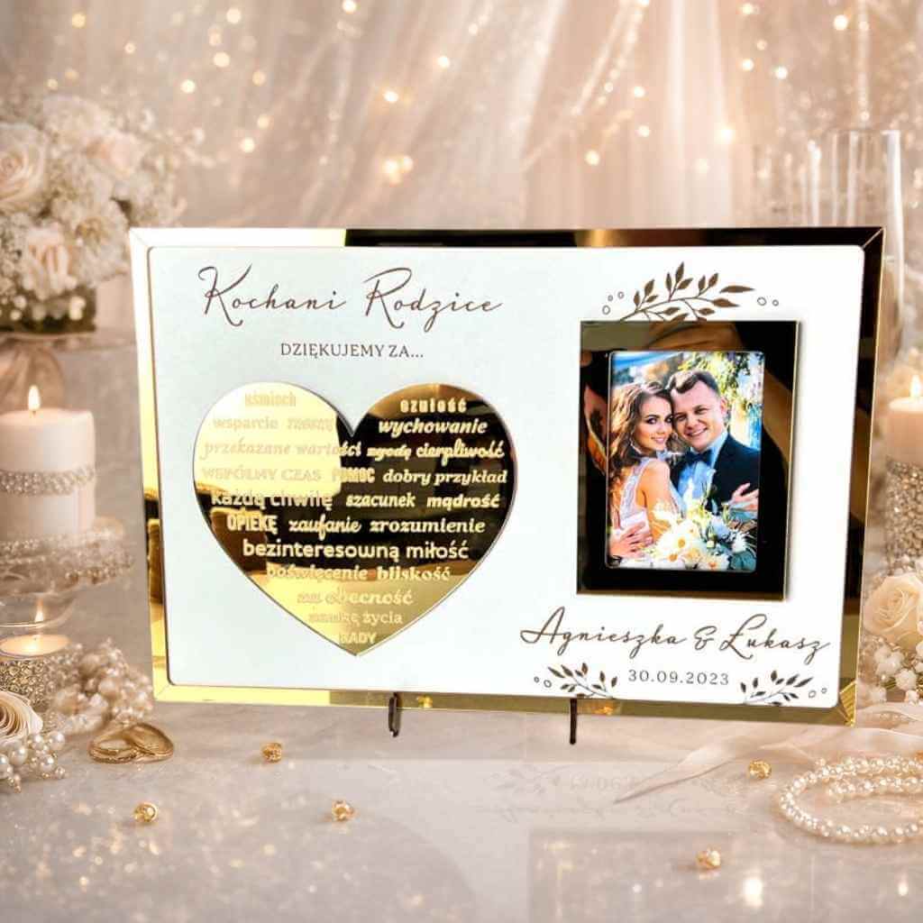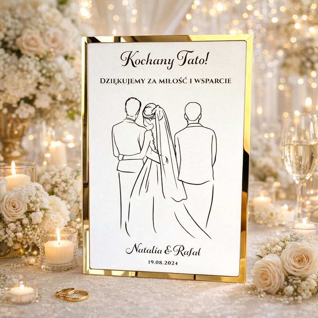 To sytuacja wymagająca wyczucia. Jeśli rodzice nie są w dobrych relacjach, zdecydowanie odradzamy jeden wspólny prezent. Lepiej postawić na dwa osobne upominki o tej samej stylistyce, ale z indywidualnymi dedykacjami, które wręczycie każdemu z rodziców osobno (np. rano w domu lub w mniej publicznym momencie wesela).