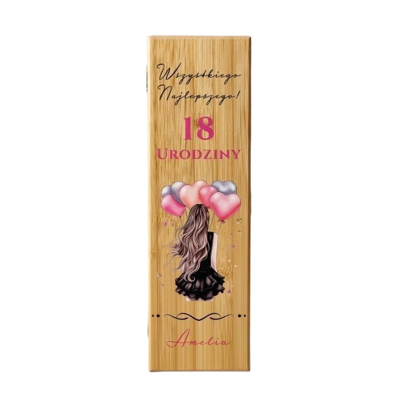 Szukasz idealnego prezentu na 18, 20, 30, 40 lub 50 urodziny? Ten zestaw w pięknym, bambusowym pudełku będzie wspaniałą pamiątką. Pudełko zdobi kolorowy, trwały nadruk UV. Grafika przedstawia stylową kobietę z pękiem balonów w kształcie serc. Balony są różowe, beżowe i srebrne. Nadruk zawiera życzenia "Wszystkiego Najlepszego!" oraz personalizowane imię jubilatki (np. Amelia, jak na zdjęciu). Centralnym punktem jest duża, różowa cyfra 18. To idealny upominek dla córki, siostry lub przyjaciółki na ten wyjątkowy dzień.