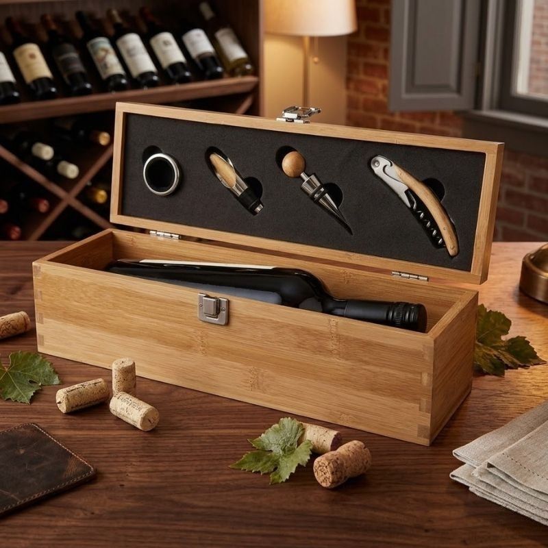 W środku pudełka znajdziesz cztery niezbędne akcesoria do wina. Są one ułożone w precyzyjnie dopasowanej, piankowej wkładce.