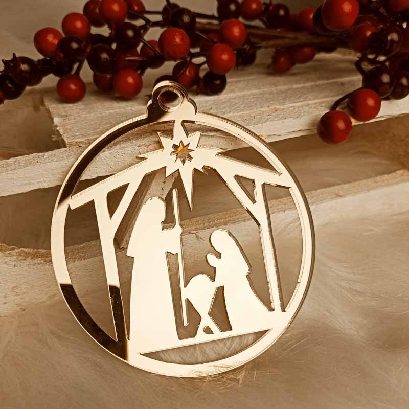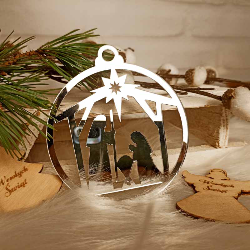 Bożonarodzeniowa Lustrzana Zawieszka z motywem stajenki dodaje blasku choince i tworzy wyjątkowy świąteczny nastrój.
