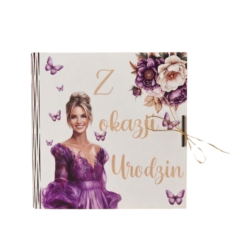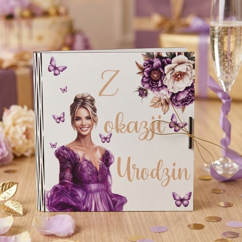Wręczanie gotówki w zwykłej, papierowej kopercie odchodzi do lamusa, szczególnie przy tak ważnej okazji, jaką jest wkroczenie w dorosłość. Jeśli zastanawiasz się, jak przekazać prezent finansowy z klasą i pomysłem, nasze pudełko to idealne rozwiązanie. Zewnętrzna strona przyciąga wzrok damskim, eleganckim motywem z wizerunkiem kobiety w sukience, z fioletowymi detalami oraz wyrazistym napisem „Z okazji urodzin”. Całość tworzy efektowną oprawę, która z pewnością zaskoczy i ucieszy każdą kobietę.