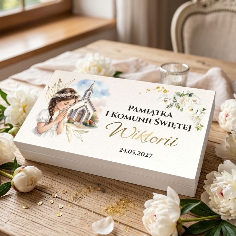 Drewniane pudełko na pieniądze na Pierwszą Komunię Świętą dla dziewczynki elegancka pamiątka personalizowana