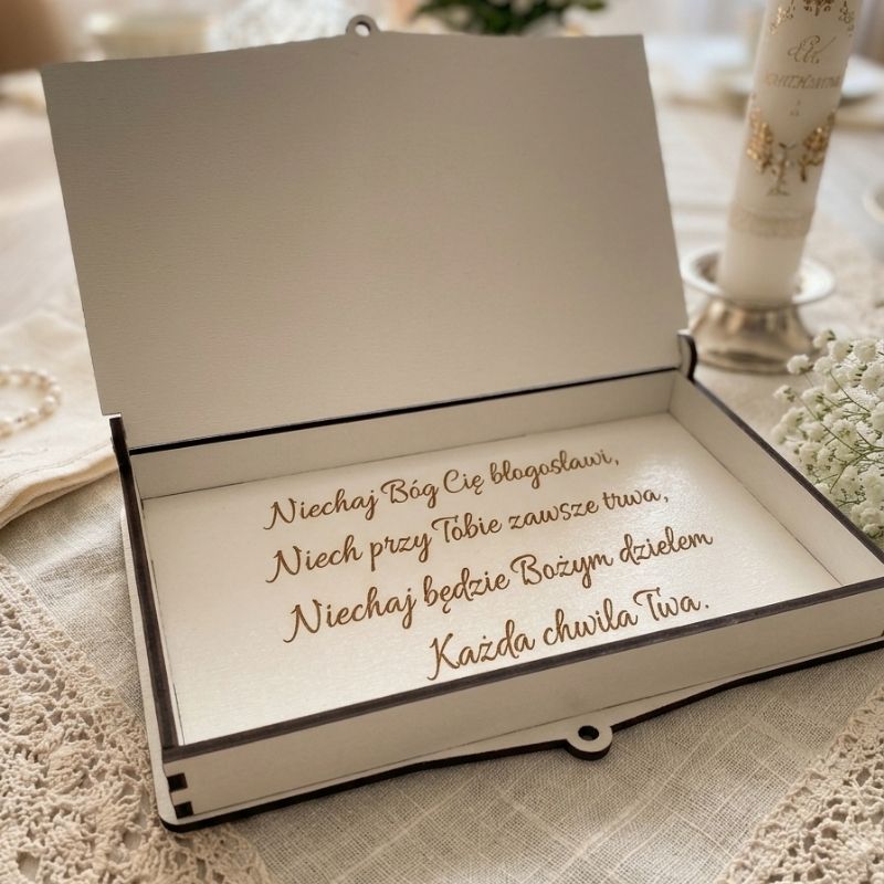 Jeśli zastanawiasz się, w czym wręczyć pieniądze na Komunię, aby prezent wyglądał uroczyście i z klasą, nasza elegancka kasetka z białej płyty HDF jest idealnym rozwiązaniem. To stylowa i trwała alternatywa dla papierowej koperty, która często gniecie się lub gubi wśród innych kartek. Wybierając kasetkę w formie Pisma Świętego, zamieniasz zwykły podarunek gotówkowy w piękną, personalizowaną pamiątkę, którą dziecko może zachować na lata jako pudełko na drobne skarby lub różaniec.