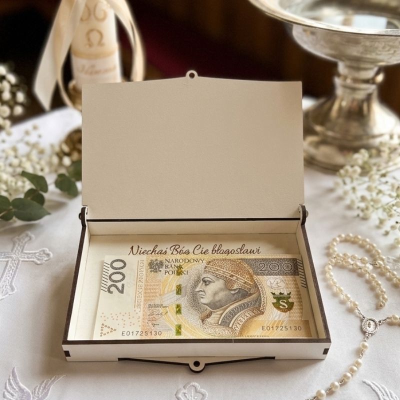 Głębokość kasetki (2 cm) pozwala na umieszczenie w niej nie tylko gotówki, ale także drobnych pamiątek, takich jak różaniec, medalik w pudełeczku, biżuteria czy spersonalizowany liścik z życzeniami.