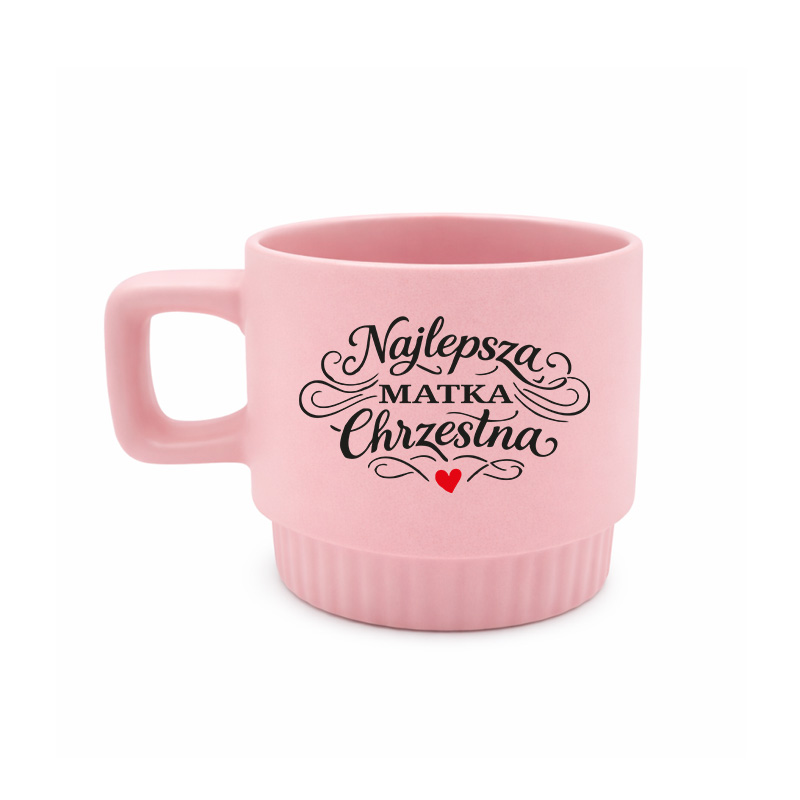 Różowy kubek ryflowany ceramiczny z napisem Najlepsza Matka Chrzestna