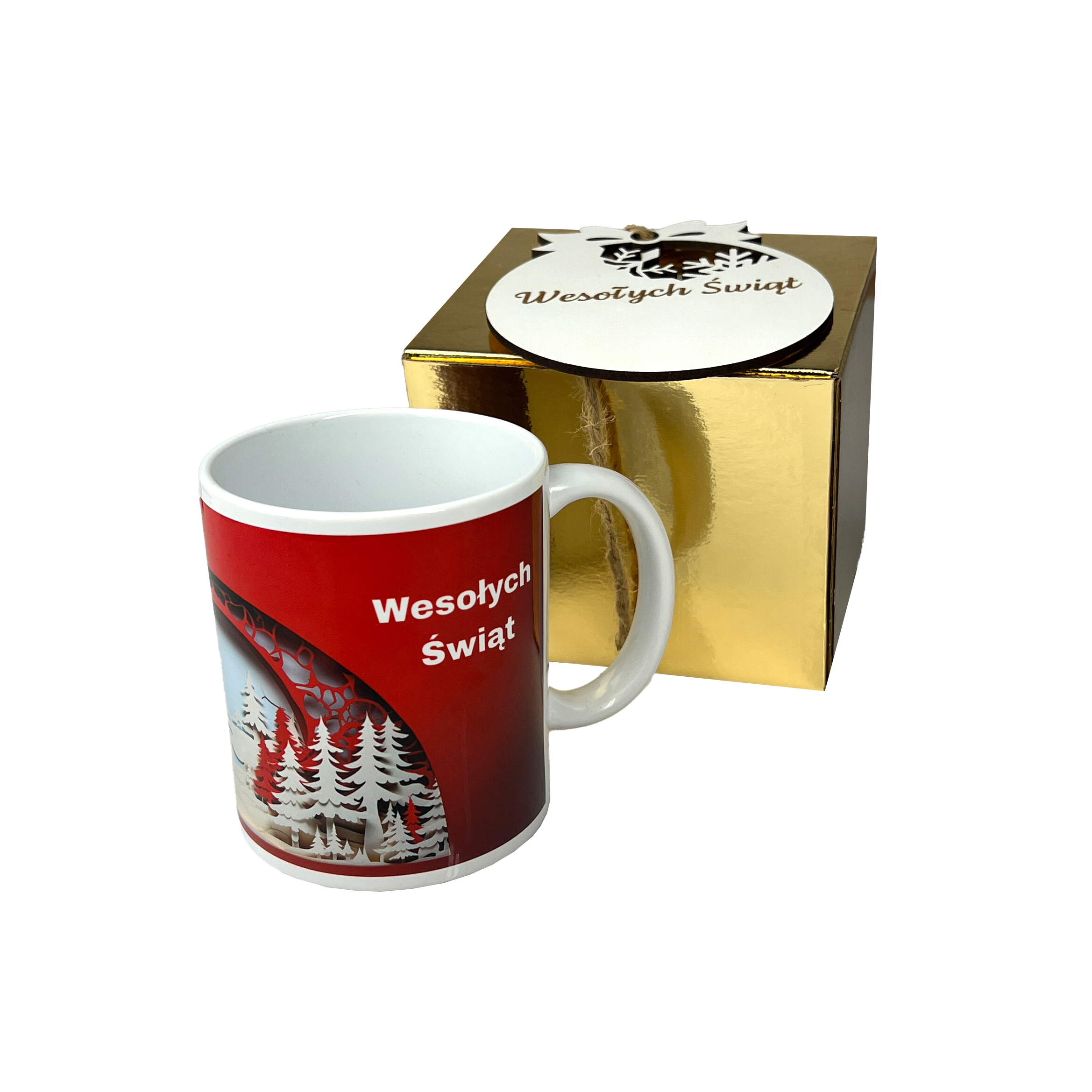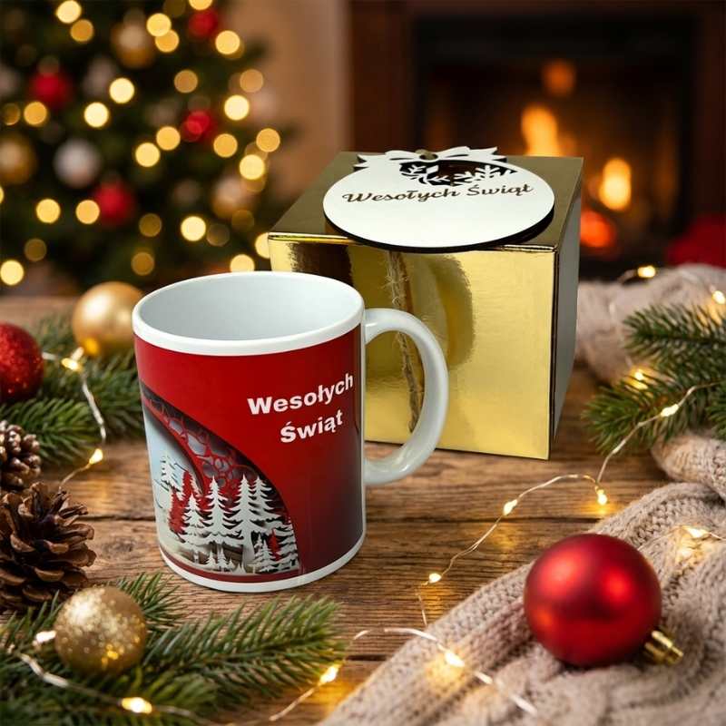 Elegancki kubek świąteczny z napisem „Wesołych Świąt” w pięknym, ekologicznym pudełku prezentowym. Idealny jako upominek dla bliskich, pracowników lub klientów. Trwała ceramika, estetyczny nadruk i gotowe świąteczne opakowanie.