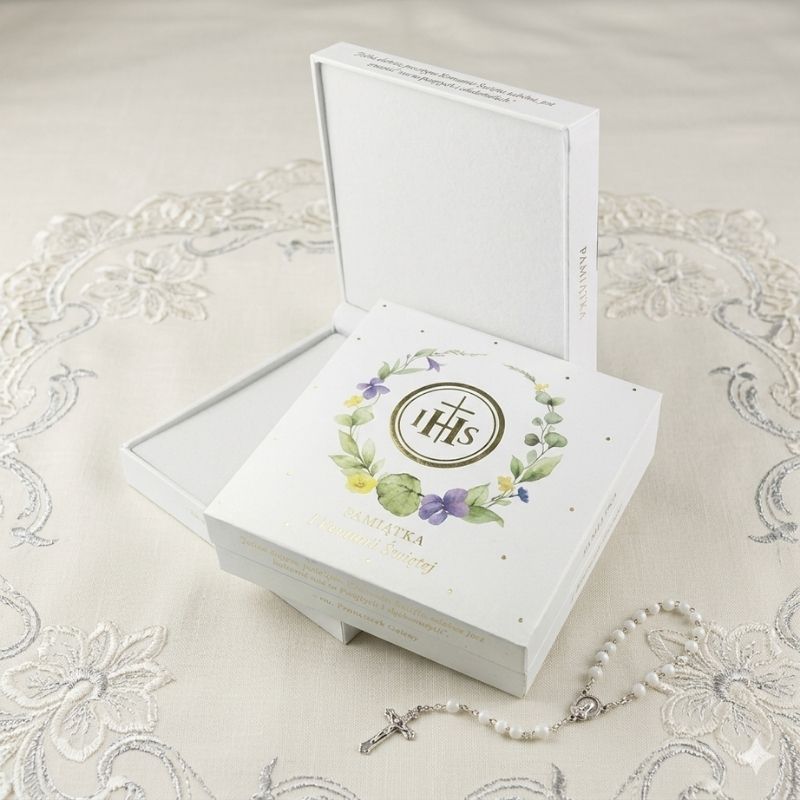 Wzornictwo pudełka łączy w sobie nowoczesne trendy z klasyczną symboliką religijną. Wieczko ozdobione jest delikatnym, akwarelowym motywem zielonych gałązek eukaliptusa, który nadaje całości świeżości i naturalnego uroku. Centralnym punktem jest precyzyjny, srebrny nadruk z hostią i monogramem IHS oraz napis "PAMIĄTKA Komunii Świętej". Tekst wykonany jest przepiękną, ozdobną kaligrafią, która w połączeniu ze srebrzystym połyskiem tworzy efektowny i luksusowy wygląd. Dodatkowego blasku dodają subtelne, srebrne kropeczki imitujące cyrkonie, rozsypane wokół grafiki. Ten wyjątkowy design pudełka komunijnego sprawia, że wyróżnia się ono na tle standardowych opakowań.