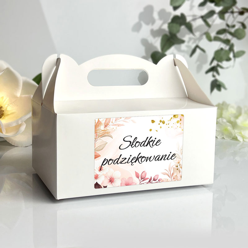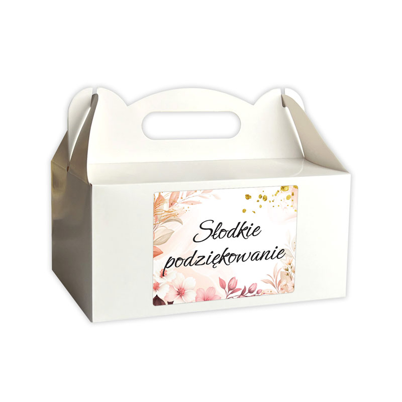 W naszej ofercie dostępnych jest kilka wzorów etykiet na pudełka z ciastem – dopasowanych do różnych okazji, takich jak ślub, chrzest czy inne uroczystości rodzinne.