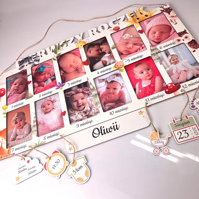 Pierwszy rok życia dziecka jest pełen wyjątkowych chwil. Każdy uśmiech, pierwszy krok i pierwsze słowo to wspomnienia, które warto zachować. Nasza personalizowana ramka na 12 zdjęć dla dziecka z kolorowym nadrukiem zwierzątek pozwala uwiecznić te momenty w pięknej formie. Ramka pomieści 12 pionowych zdjęć w formacie 10×15 cm, a bajkowy motyw leśnych zwierzątek nadaje wnętrzu radosny i przyjazny klimat. To nie tylko praktyczna dekoracja, ale również wyjątkowa pamiątka, do której będziecie wracać przez lata.