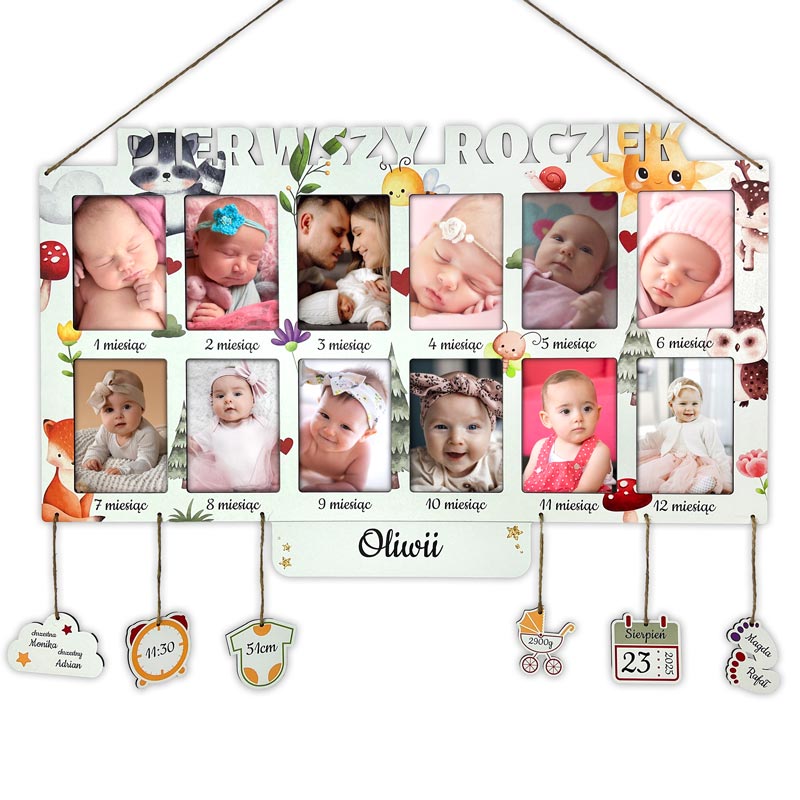 Personalizowana ramka na 12 zdjęć z kolorowym nadrukiem zwierzątek. Idealny prezent na chrzest, roczek lub pamiątkę pierwszego roku życia dziecka.