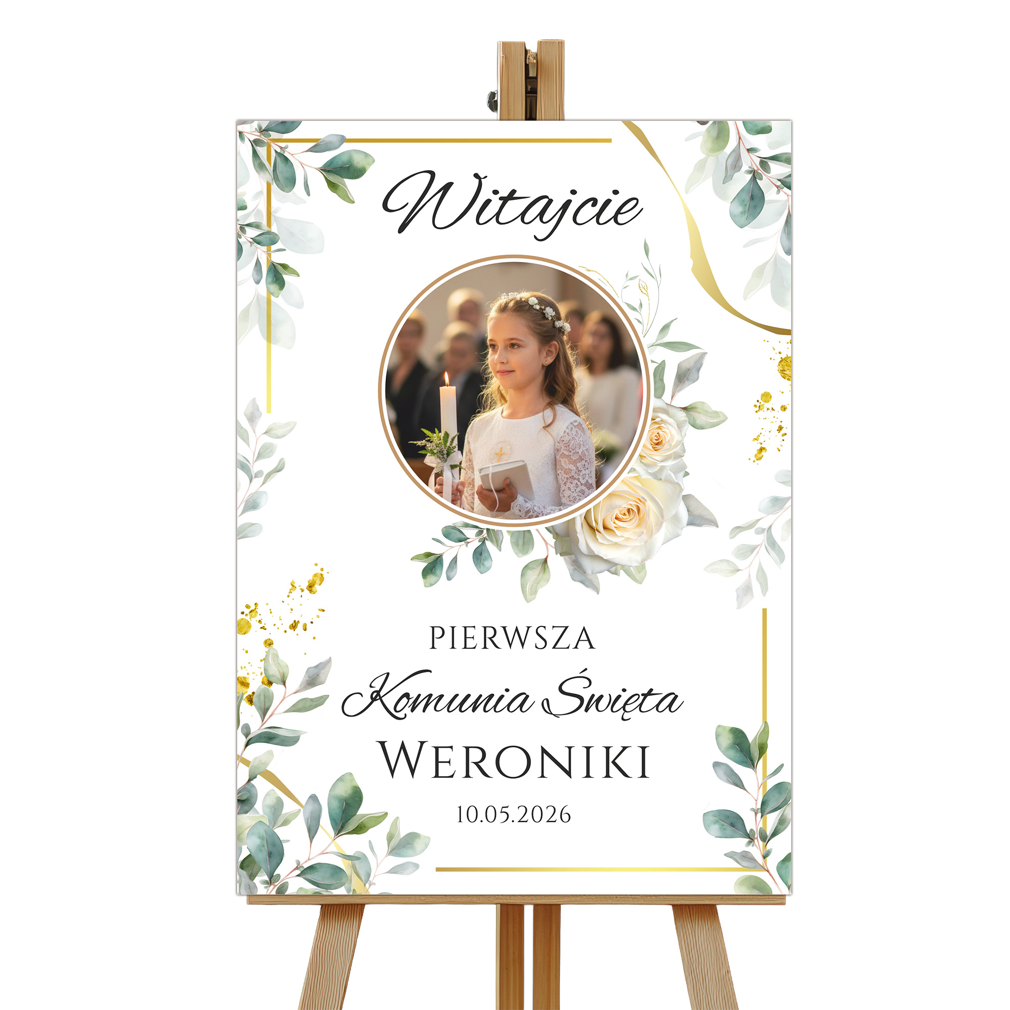Plakat Powitalny na Komunię ze Zdjęciem Gałązka Eukaliptusa – Nowoczesna Elegancja i Efekt WOW