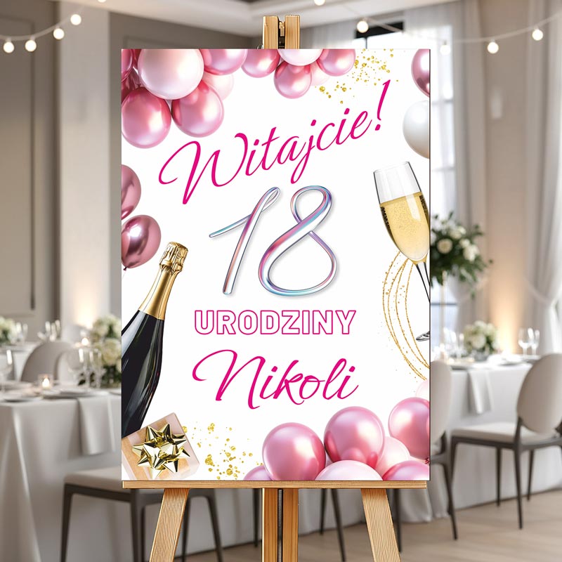 Tablica Powitalna na Przyjęcie Urodzinowe z Imieniem dla Dziewczyny – Ciekawa i Stylowa Dekoracja Sali w Różowym Kolorze