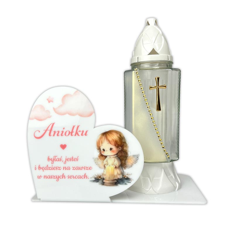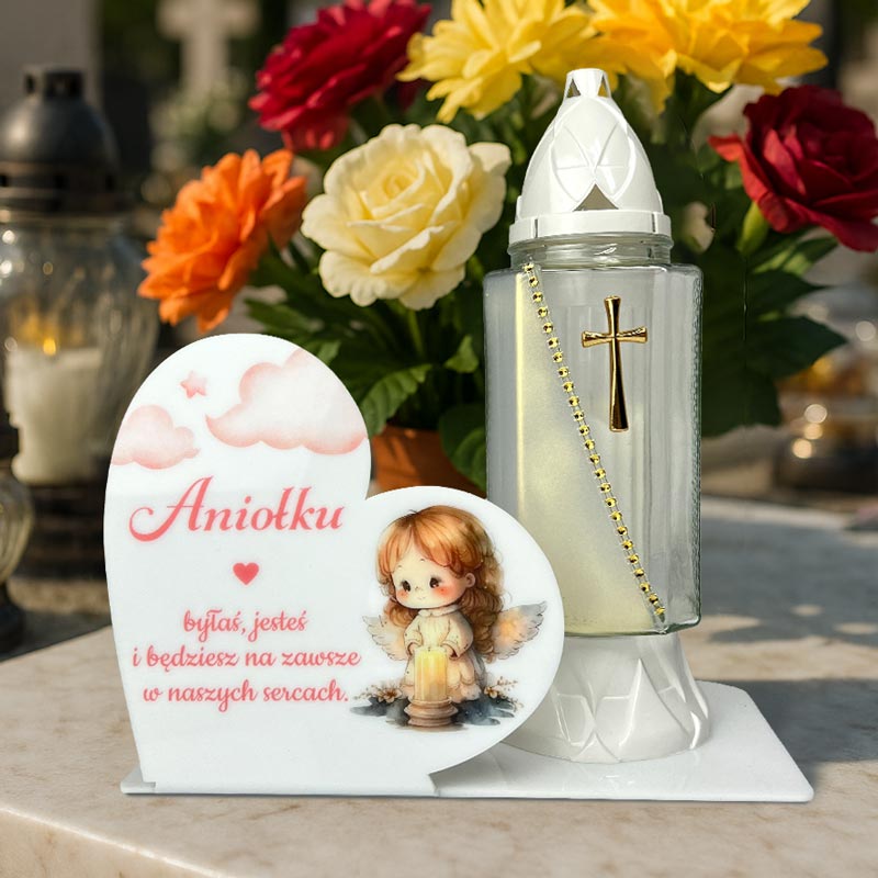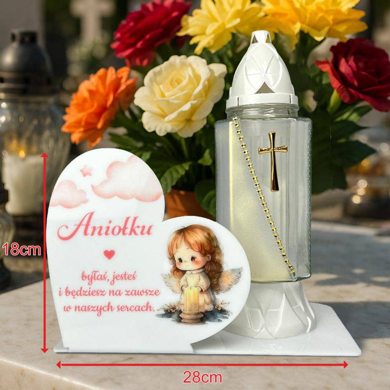 To nie tylko ozdoba na grób dziecka, ale również trwały symbol pamięci, który idealnie współgra z innymi dekoracjami nagrobnymi, takimi jak kwiaty, wiązanki czy figurki aniołków. Jej biała powierzchnia pięknie odbija światło zniczy, tworząc spokojną i pełną zadumy atmosferę.