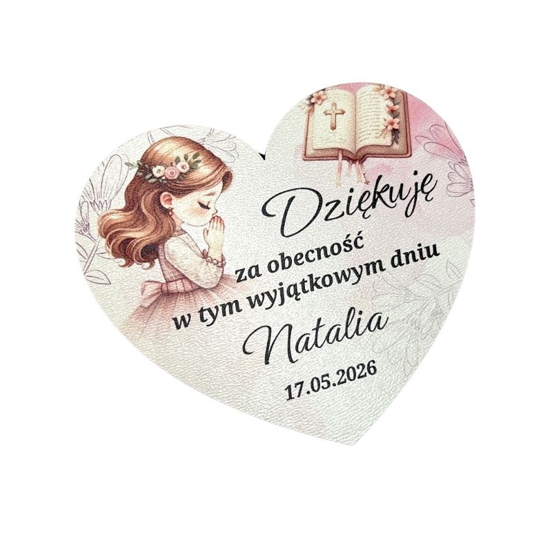 Elegancki magnes na komunię serce w stylu akwarelowym (watercolor) z motywem modlącej się dziewczynki