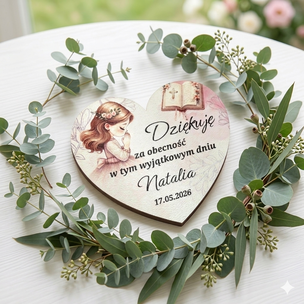 Podziękowanie dla gości w kształcie serca to elegancka pamiątka Komunii 2026, która dzięki modnemu motywowi akwarelowemu oraz wysokiej jakości wykonania stanowi wyjątkowy sposób na podziękowanie gościom za ich obecność.