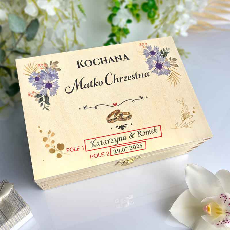 Nasza drewniana herbaciarka z kolorowym nadrukiem łączy estetykę z funkcjonalnością. Wykonana z wysokiej jakości drewna, posiada 6 przegródek, które można wypełnić ulubionymi herbatami, słodkościami czy drobnymi upominkami. Na wieku znajduje się spersonalizowany nadruk – imiona Młodej Pary oraz data ślubu, co sprawia, że jest to prezent dla chrzestnej unikalny i pełen emocji. Delikatny, kwiatowy wzór nadaje całości subtelnego uroku, a złote zapięcie dodaje elegancji i prestiżu.