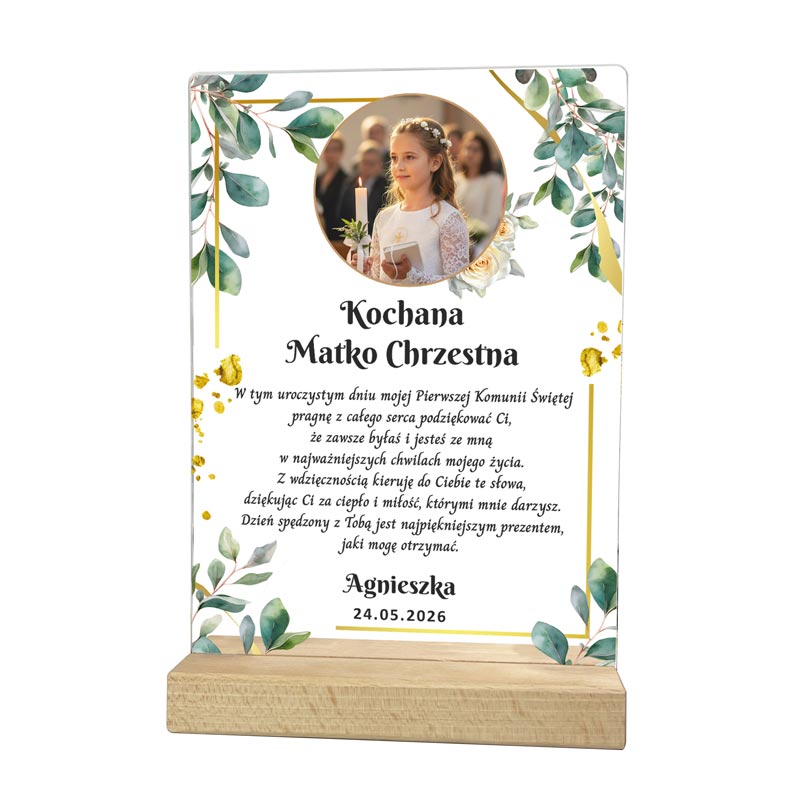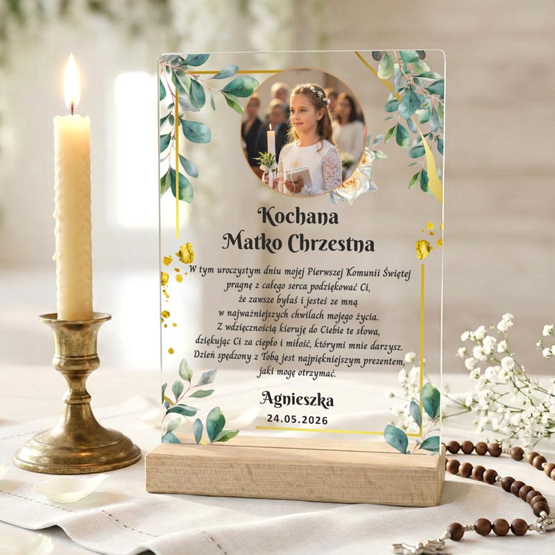 Podaruj bliskim wyjątkowe, personalizowane podziękowanie dla chrzestnych na Pierwszą Komunię Świętą. Eleganckie połączenie akrylu, drewna i zielonych gałązek eukaliptusa.