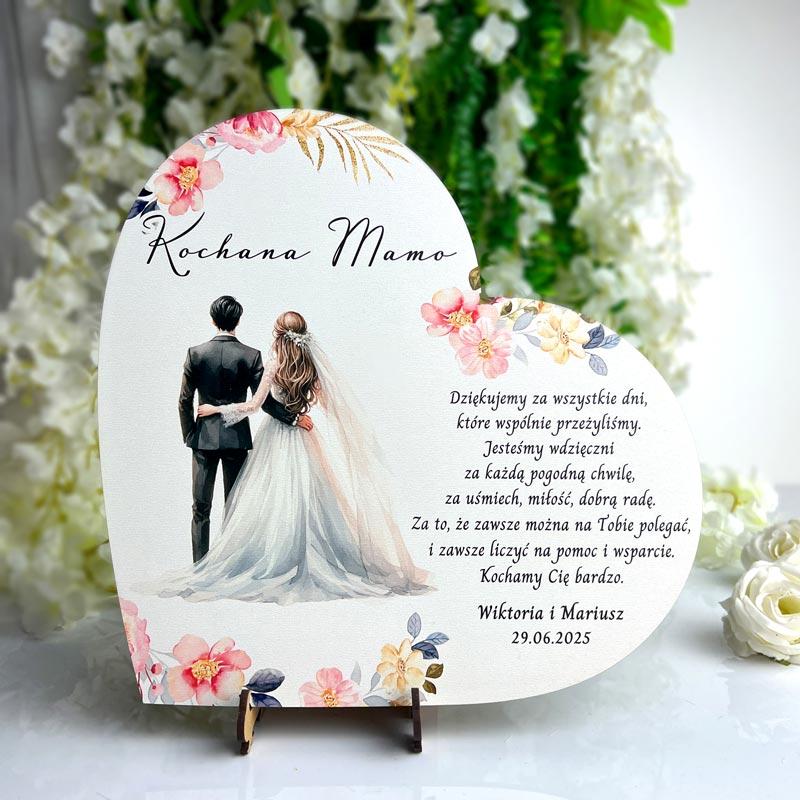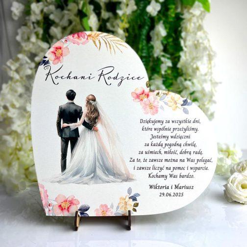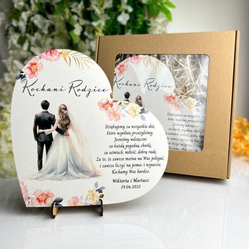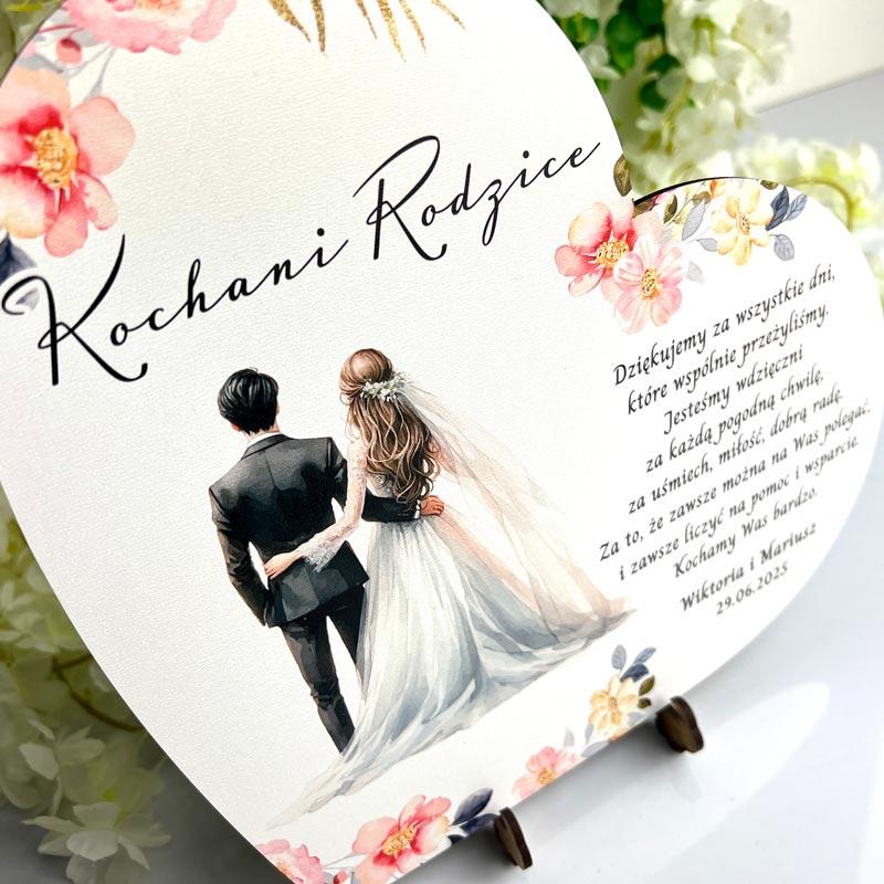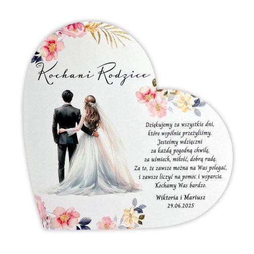 Na sercu znajduje się graficzny rysunek młodej pary, otoczonej kolorowymi kwiatami, co symbolizuje miłość, piękno i harmonię w życiu młodych małżonków. Obok tej wzruszającej grafiki widnieje stały, klasyczny wiersz, który z pewnością poruszy serca rodziców. Wiersz podziękowania stanowi istotną część tego podarunku – jest to forma wyrażenia głębokiej wdzięczności za wychowanie, wsparcie oraz miłość, którą rodzice obdarzali młodą parę przez całe jej życie.