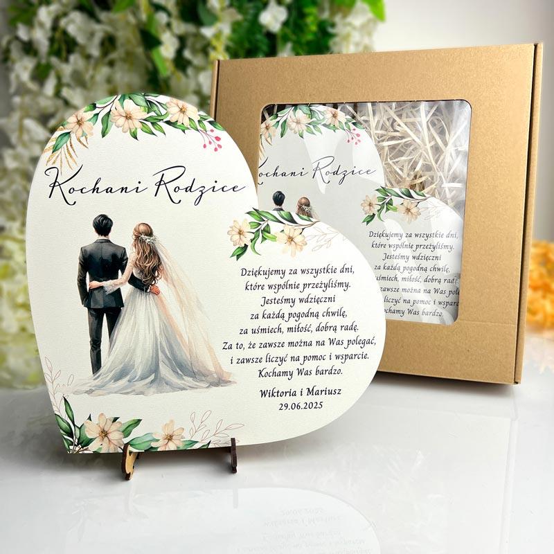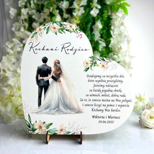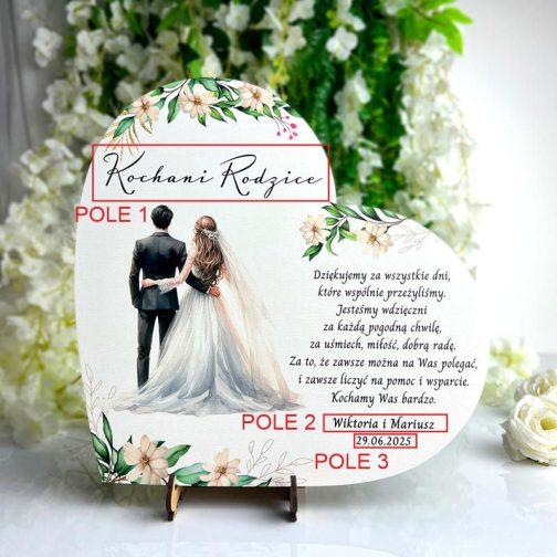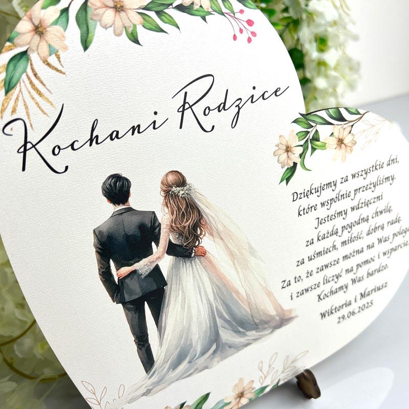 Na sercu znajduje się graficzny rysunek młodej pary, otoczonej kolorowymi kwiatami, co symbolizuje miłość, piękno i harmonię w życiu młodych małżonków. Obok tej wzruszającej grafiki widnieje stały, klasyczny wiersz, który z pewnością poruszy serca rodziców. Wiersz podziękowania stanowi istotną część tego podarunku – jest to forma wyrażenia głębokiej wdzięczności za wychowanie, wsparcie oraz miłość, którą rodzice obdarzali młodą parę przez całe jej życie.