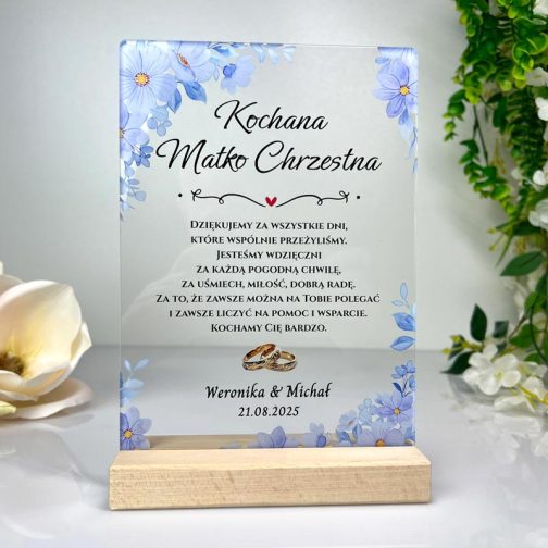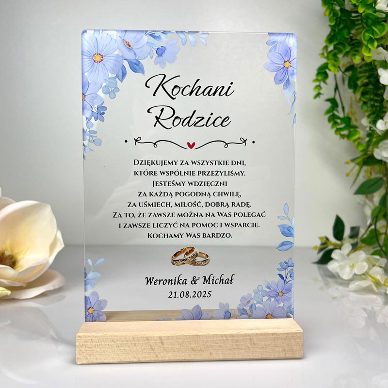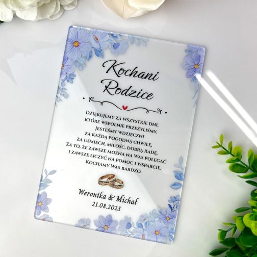 Podziękowanie dla bliskich w dniu ślubu to piękny moment, aby wyrazić im wdzięczność za ich obecność i wsparcie. Nasze personalizowane podziękowanie dla rodziców ślubne niebieskie przezroczystej pleksi to idealny sposób, aby w elegancki i trwały sposób podziękować rodzicom, dziadkom, świadkom czy chrzestnym. To nie tylko symboliczny gest, ale także wyjątkowa pamiątka, która będzie cieszyć przez długie lata. Podziękowanie dla rodziców ślubne niebieskie wykonane jest z wysokiej jakości przezroczystej pleksi o grubości 3 mm, co nadaje mu nowoczesny i elegancki wygląd. Gwarantuje to trwałość i odporność na uszkodzenia. Kolorowy nadruk UV, naniesiony bezpośrednio na pleksi, zapewnia wyraziste i intensywne barwy oraz doskonałą jakość grafiki. Motywy delikatnych, błękitnych kwiatów, widoczne na załączonych zdjęciach, dodają mu świeżości i subtelnego charakteru, idealnie wpisując się w romantyczną estetykę ślubną. Podstawka widoczna na zdjęciach nie jest częścią zestawu i można ją dokupić osobno.