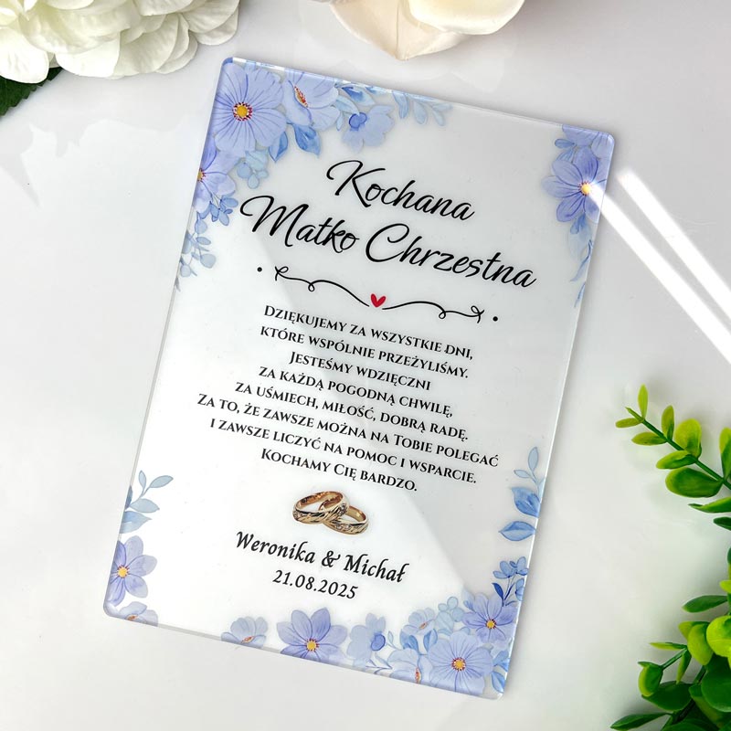 - Unikalna personalizacja: Podziękowanie zawiera imiona, datę ślubu oraz wybraną dedykację, taką jak "Kochana Matko Chrzestna", "Kochany Ojcze Chrzestny" czy "Kochani Rodzice Chrzestni", co czyni je niezwykle osobistą pamiątką.