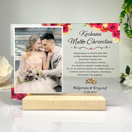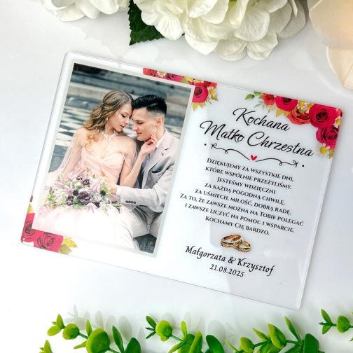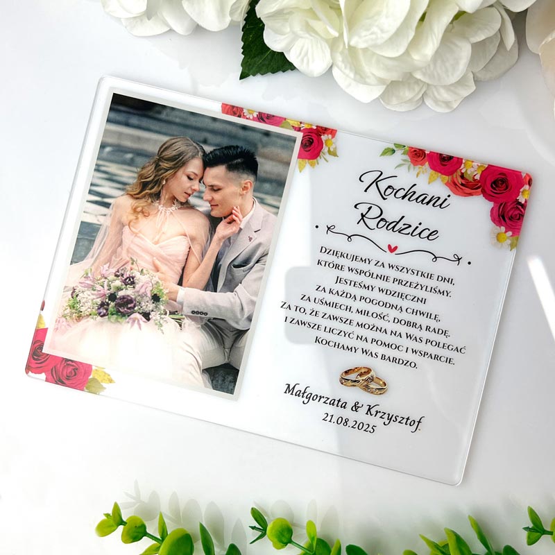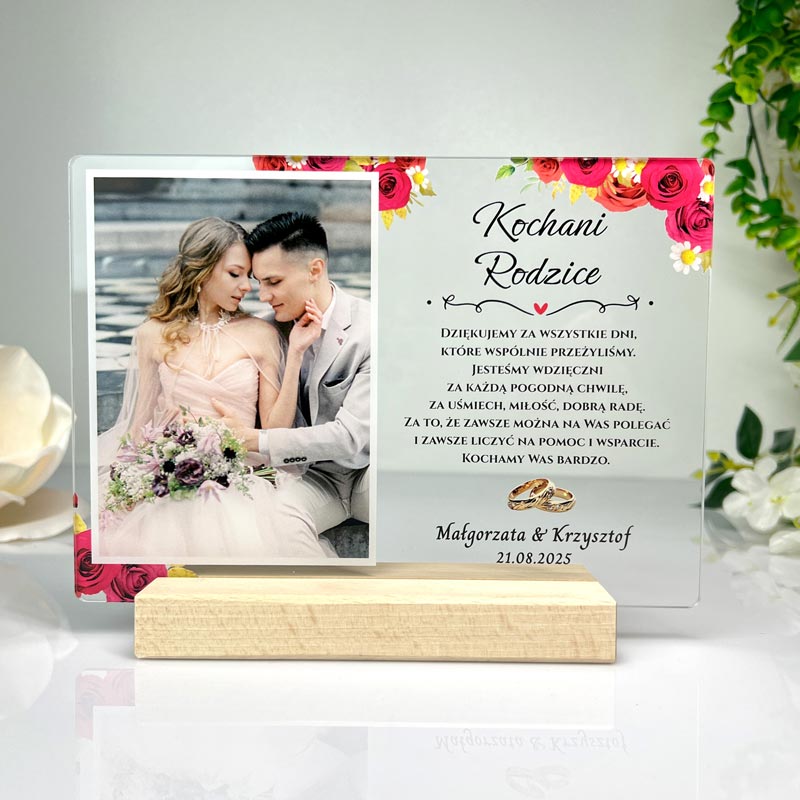 To wyjątkowe podziękowanie dla Rodziców ze zdjęciem czerwone zostało wykonane z najwyższej jakości przezroczystej pleksi o grubości 3 mm, co gwarantuje mu nowoczesny i elegancki wygląd oraz odporność na uszkodzenia. Kolorowy nadruk UV, naniesiony bezpośrednio na powierzchnię plexi, zapewnia niezwykle żywe, intensywne barwy i precyzyjne odwzorowanie detali graficznych. Motywy intensywnie czerwonych róż, widoczne na załączonych obrazach, nadają mu klasyki i romantycznego charakteru, idealnie komponując się ze ślubną estetyką. Prosimy pamiętać, że podstawka prezentowana na zdjęciach nie jest częścią standardowego zestawu i jest dostępna do zakupu osobno.