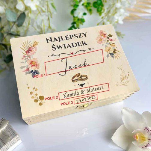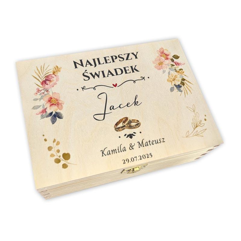 Nasza drewniana herbaciarka z nadrukiem uv została wykonana z wysokiej jakości naturalnego drewna. Skrzynka posiada 6 przegródek, które można wypełnić ulubionymi herbatami, słodkościami lub drobnymi upominkami. Personalizacja obejmuje imię świadka, imiona Pary Młodej oraz datę ślubu, co nadaje jej unikalnego charakteru. Całość zdobi subtelny, kolorowy nadruk kwiatowy, tworząc spójny i estetyczny design.