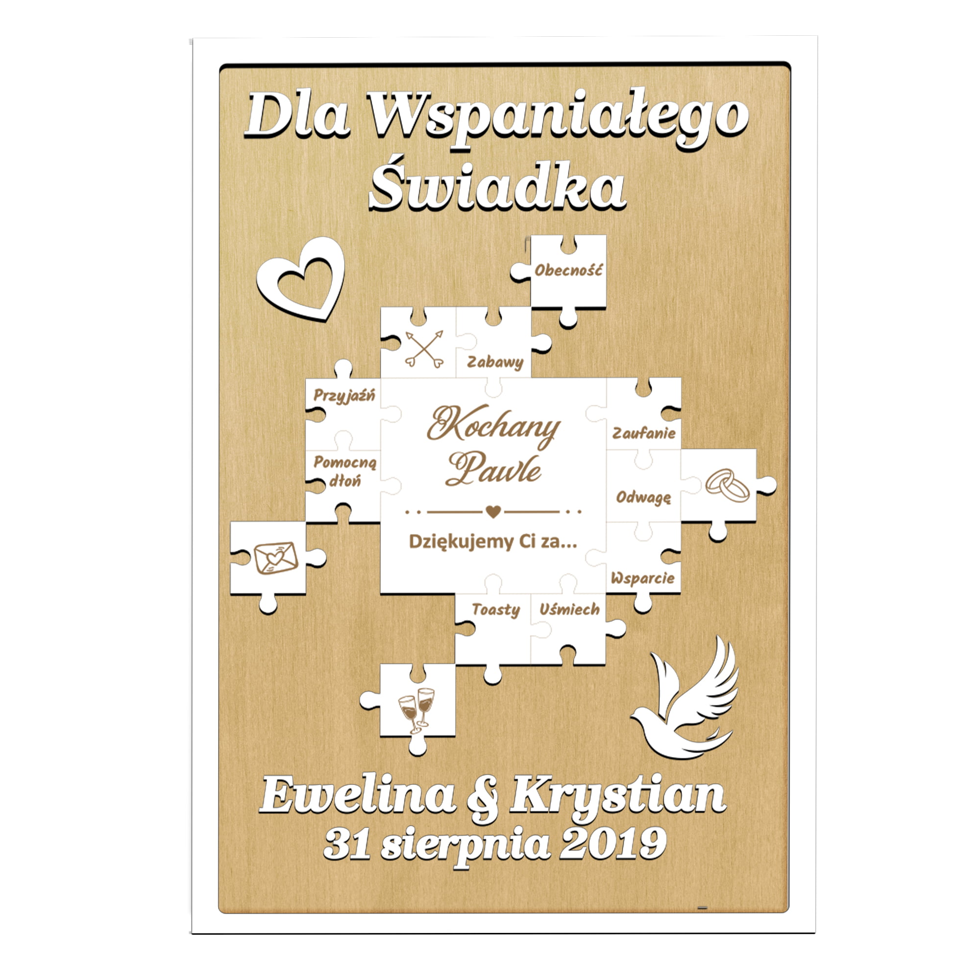 Ta elegancka drewniana ramka stanowi estetyczną oprawę dla najpiękniejszych słów wdzięczności, zapisanych w środku. Wyjątkowe podziękowania dla świadka zawierają najgłębsze emocje i uczucia, dziękując mu za zaufanie, wsparcie, wspólne chwile, poświęcenie i wiele innych. Personalizacja imion i daty ślubu sprawia, że staje się to nie tylko prezentem, ale także wyjątkowym wspomnieniem.