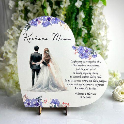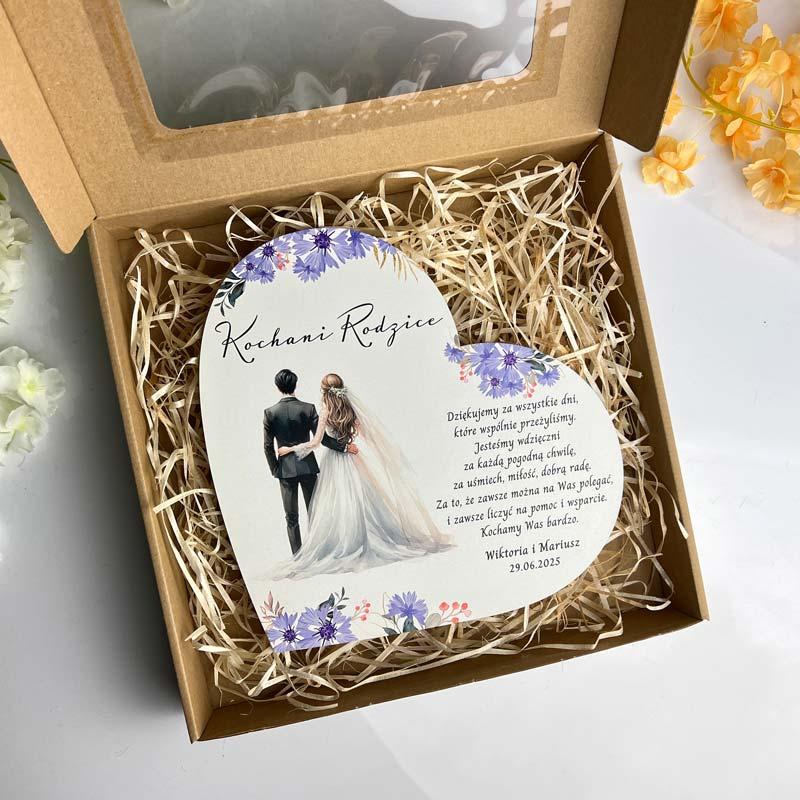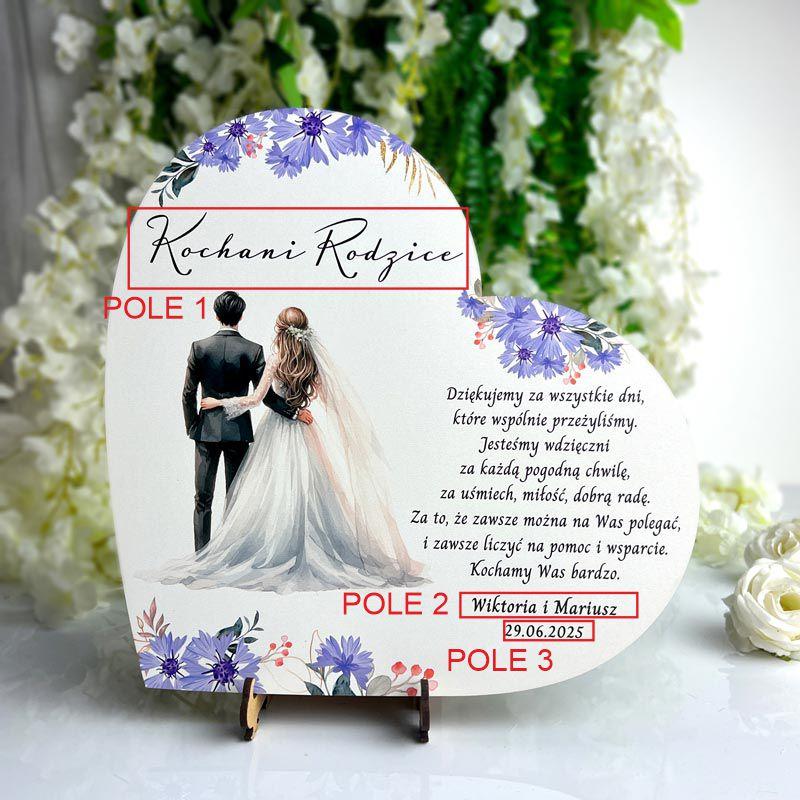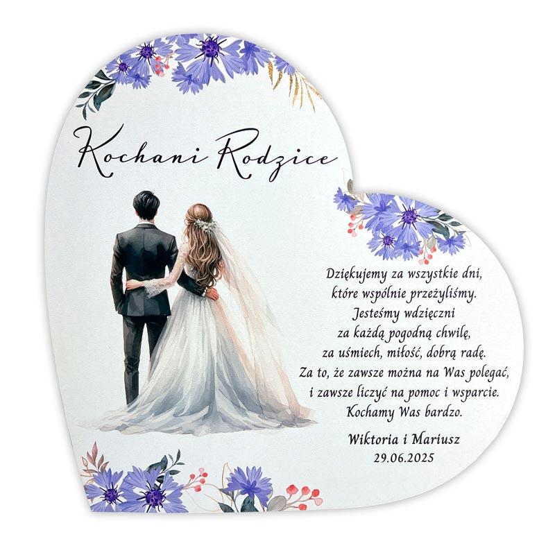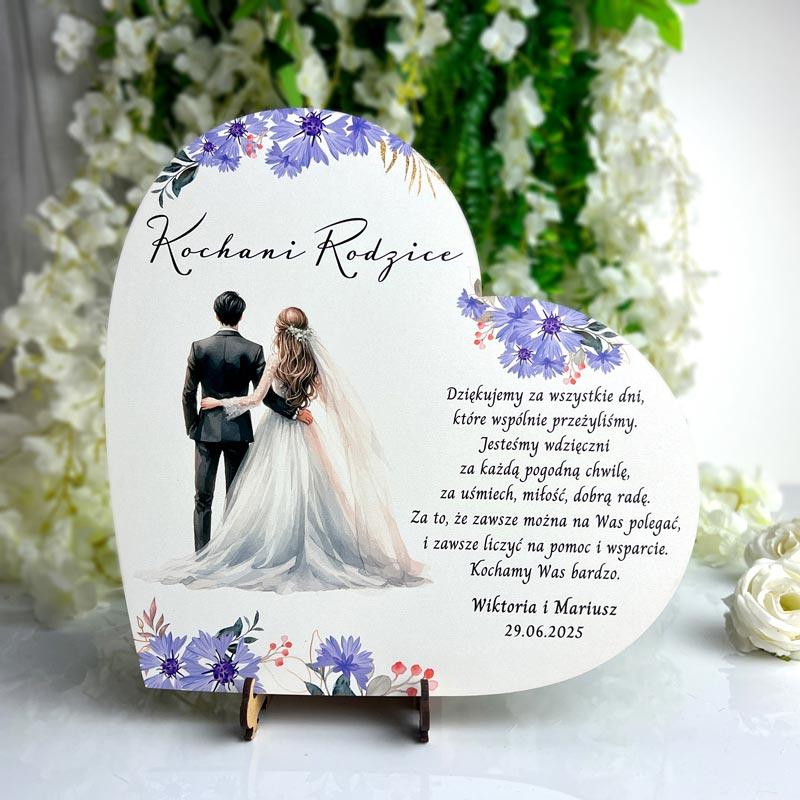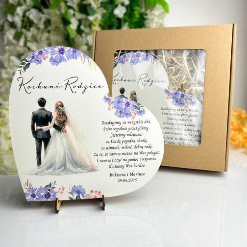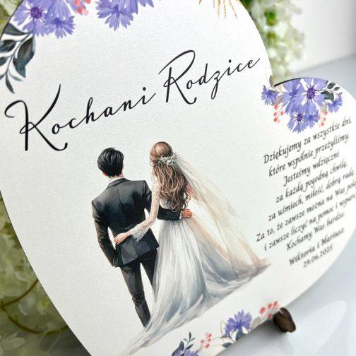 Na sercu znajduje się graficzny rysunek młodej pary, otoczonej kolorowymi kwiatami, co symbolizuje miłość, piękno i harmonię w życiu młodych małżonków. Obok tej wzruszającej grafiki widnieje stały, klasyczny wiersz, który z pewnością poruszy serca rodziców. Wiersz podziękowania stanowi istotną część tego podarunku – jest to forma wyrażenia głębokiej wdzięczności za wychowanie, wsparcie oraz miłość, którą rodzice obdarzali młodą parę przez całe jej życie.