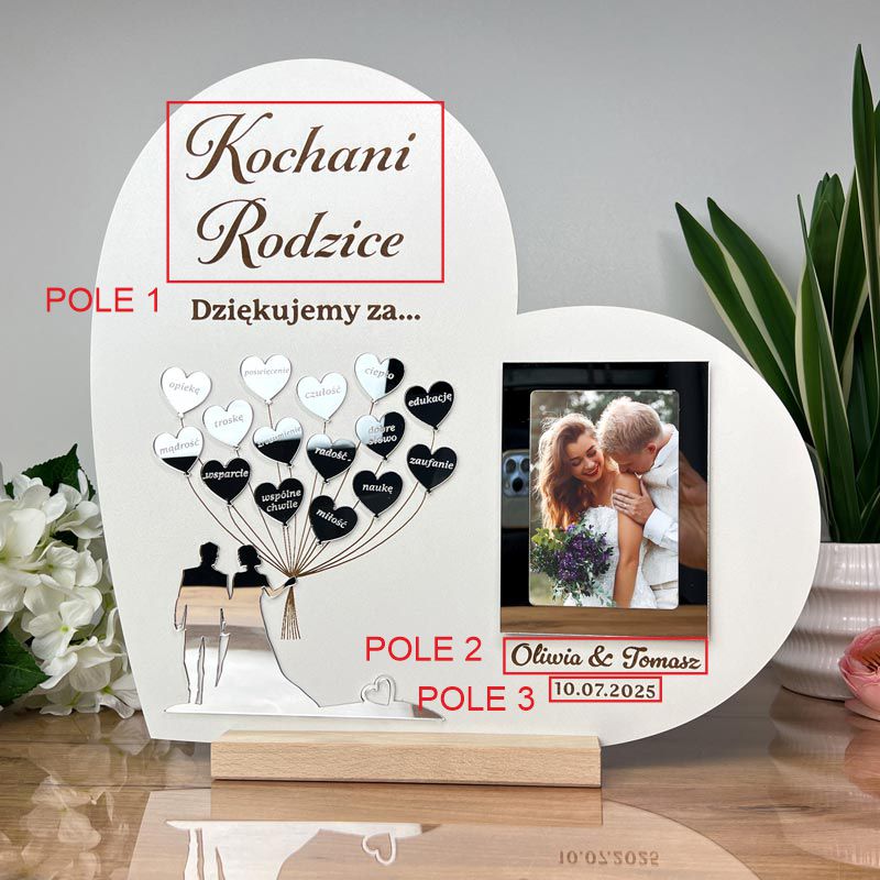 W centralnej części serca znajduje się Młoda Para trzymająca baloniki, wykonana z efektownej złotej lustrzanej pleksi. Element ten jest osadzony w przestrzeni, co nadaje całości trójwymiarowy (3D) efekt i wyjątkowy charakter. Dodatkowo, w podziękowaniu została umieszczona ramka na zdjęcie w formacie 9x13 cm, w której można umieścić wspólną fotografię lub ulubione rodzinne ujęcie – dzięki temu prezent ślubny dla mamy i taty staje się jeszcze bardziej osobisty i sentymentalny.