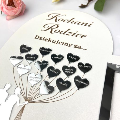 Oferowany model został zaprojektowany tak, aby można go było zarówno powiesić na ścianie, jak i postawić na półce. Dzięki temu podziękowanie świetnie dopasuje się do każdego wnętrza – salonu, sypialni czy domowego biura. To nie tylko dekoracja – to serce pełne wdzięczności dla rodziców, które codziennie będzie przypominać o tej wyjątkowej chwili.
