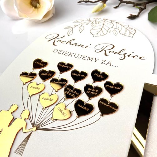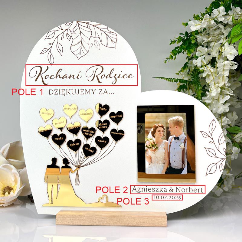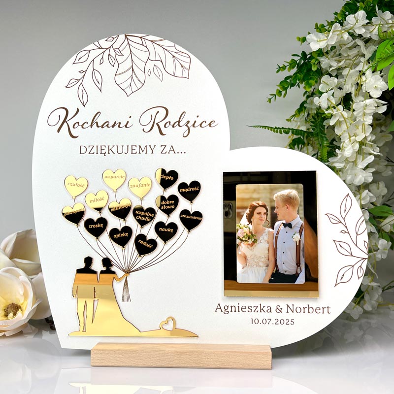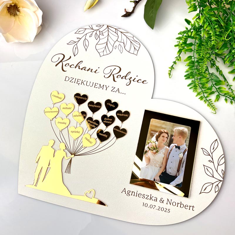 W centralnej części serca znajduje się Młoda Para trzymająca baloniki, wykonana z efektownej złotej lustrzanej pleksi. Element ten jest osadzony w przestrzeni, co nadaje całości trójwymiarowy (3D) efekt i wyjątkowy charakter. Dodatkowo, w podziękowaniu została umieszczona ramka na zdjęcie w formacie 9x13 cm, w której można umieścić wspólną fotografię lub ulubione rodzinne ujęcie – dzięki temu prezent ślubny dla mamy i taty staje się jeszcze bardziej osobisty i sentymentalny.
