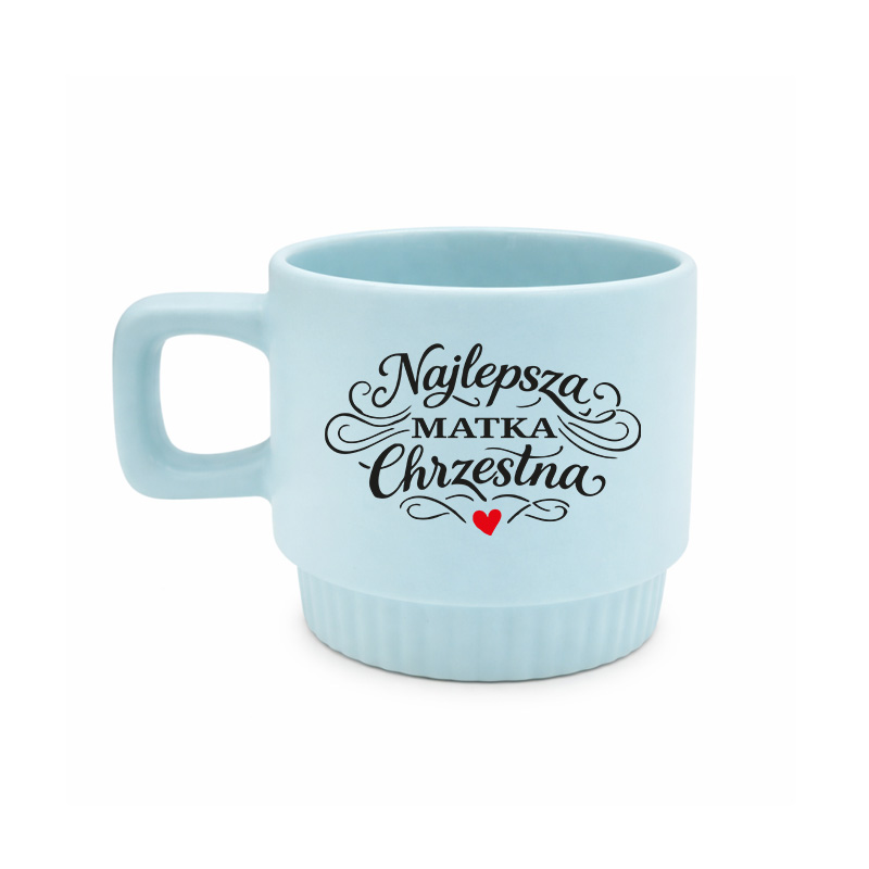 Błękitny kubek ryflowany ceramiczny z napisem Najlepsza Matka Chrzestna