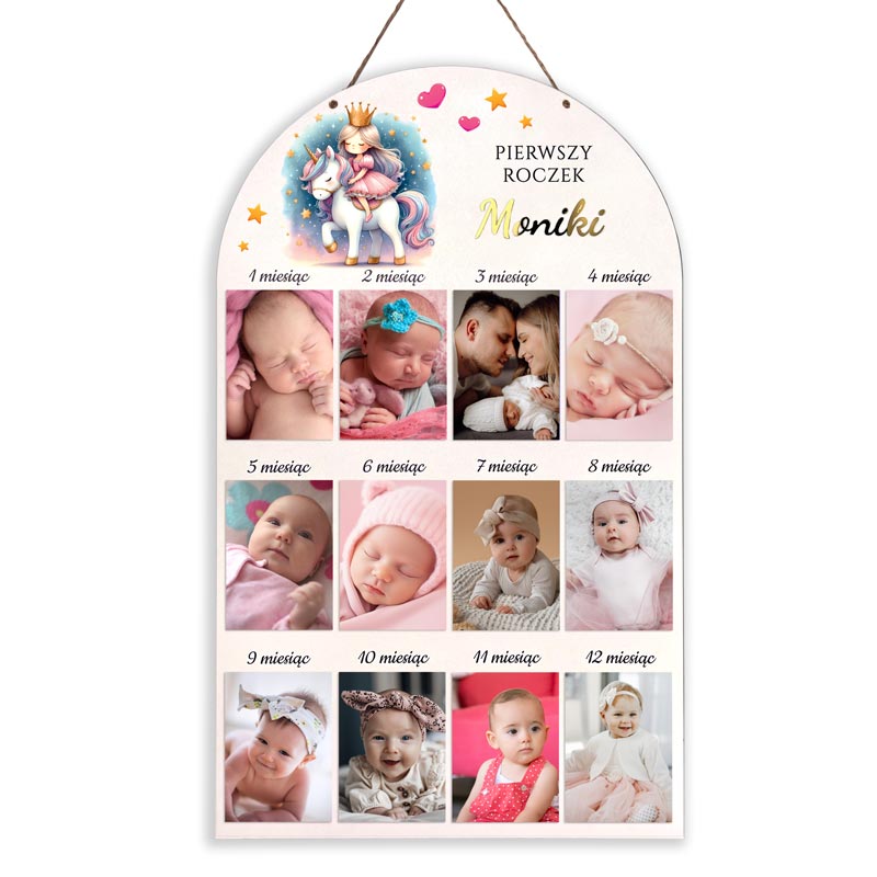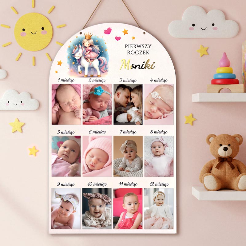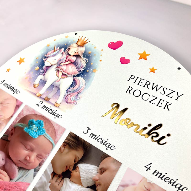 Personalizowana ramka na 12 zdjęć z pierwszego roku życia dziewczynki. Wybierz imię malucha – nadruk UV lub wycinana złota pleksi 3D. Kolorowy motyw księżniczki idealny prezent na roczek lub chrzest.