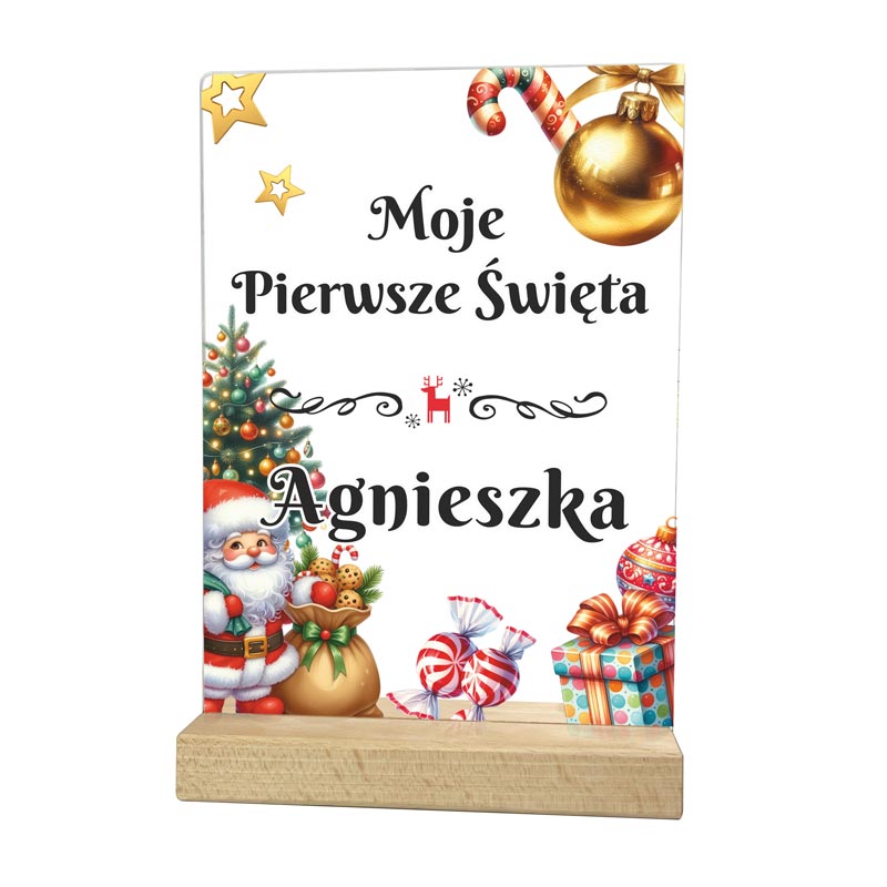 Moje Pierwsze Święta personalizowana statuetka z pleksi A5 z imieniem dziecka. Idealna pamiątka pierwszych świąt i wyjątkowy prezent dla rodziców i dziadków.