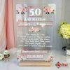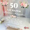 Dyplom wykonany z przezroczystego akrylu (pleksi) charakteryzuje się nowoczesnym wyglądem, który świetnie komponuje się z każdym wnętrzem. Dodatkowo kolorowy nadruk kwiatów z zielonymi listkami na przezroczystym szkle akrylowym otacza całość sentencji, tworząc piękny i harmonijny wzór. Trwałość materiału zapewnia, że pamiątka przez wiele lat będzie przypominała o wspólnie przeżytych chwilach. Grawerowane detale oraz nadrukowane kwiatowe motywy, wykonane techniką druku UV, gwarantują odporność na ścieranie i blaknięcie, dzięki czemu piękno tej pamiątki pozostanie niezmienne przez długi czas. To prezent dla rodziców, który można dostosować do indywidualnych potrzeb i preferencji jubilatów, co czyni go idealnym na każdą rocznicę ślubu.