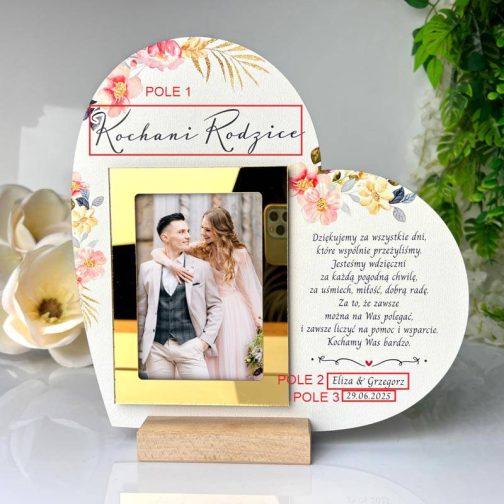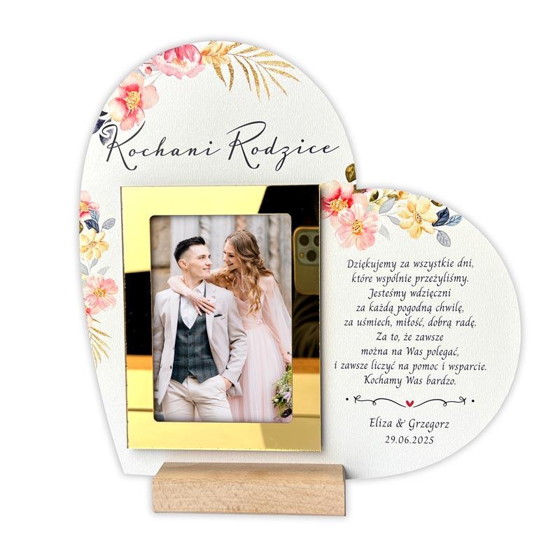 Podziękowanie ma formę serca wykonanego z białego HDF, które charakteryzuje się solidnością i estetycznym wyglądem. Dodatkowo ozdobione jest kolorowym nadrukiem UV, który zapewnia wyjątkowy efekt wizualny – wyraźne, intensywne kolory i trwałość na długie lata. Centralnym elementem serca jest złota, lustrzana ramka na zdjęcie młodej pary, która nadaje całości elegancji i wyjątkowego charakteru. Obok tej subtelnej złotej ramki na zdjęcie umieszczony został klasyczny, wzruszający wiersz, który z pewnością poruszy serca rodziców i stanie się pięknym wyrazem wdzięczności za ich miłość oraz troskę.