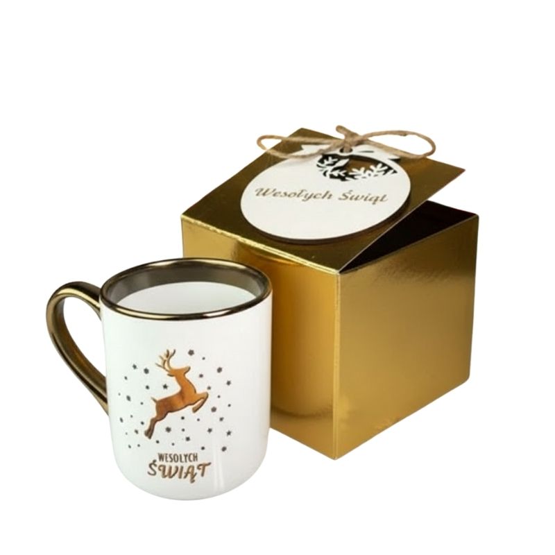 Kubek świąteczny z reniferkiem i napisem „Wesołych Świąt” zestaw ekologicznym pudełku prezentowym. Idealny jako upominek dla bliskich, pracowników lub klientów. Trwała ceramika, estetyczny nadruk i gotowe świąteczne opakowanie.