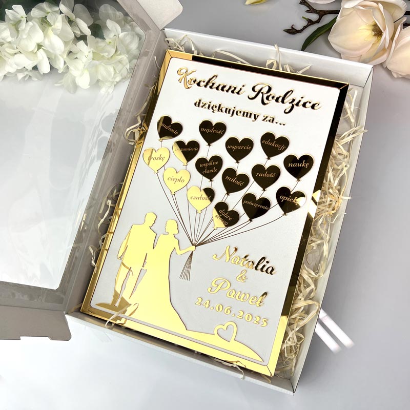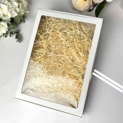 Prezentujemy eleganckie białe pudełko z okienkiem, które zostało stworzone z myślą o szczególnych chwilach – takich jak podziękowania ślubne i rocznicowe. Jego klasyczny wygląd i praktyczne wymiary wewnętrzne (420x300x50 mm) czynią je idealnym wyborem do zapakowania naszych personalizowanych podziękowań w formacie 27x40 cm. Przezroczyste okienko eksponuje zawartość w subtelny i estetyczny sposób, co sprawia, że pudełko doskonale nadaje się zarówno do wręczania prezentów, jak i do eleganckiej ekspozycji np. na weselnym stole lub w formie pamiątki.