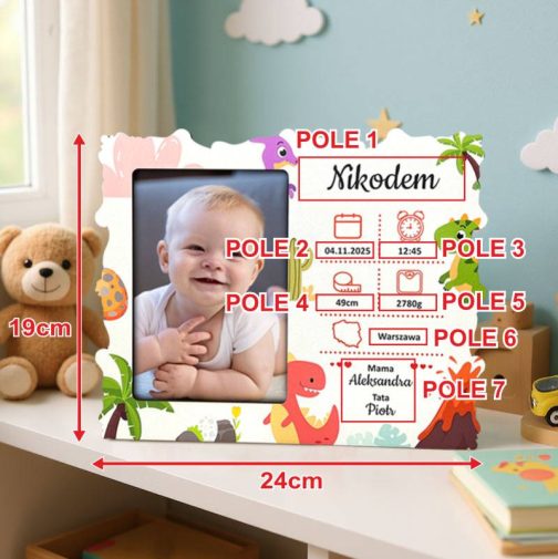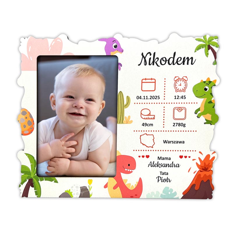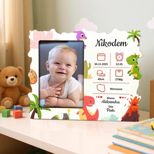 Ramka metryczka ze zdjęciem – idealny prezent na chrzest, roczek lub narodziny z kolorowym nadrukiem dinozaura