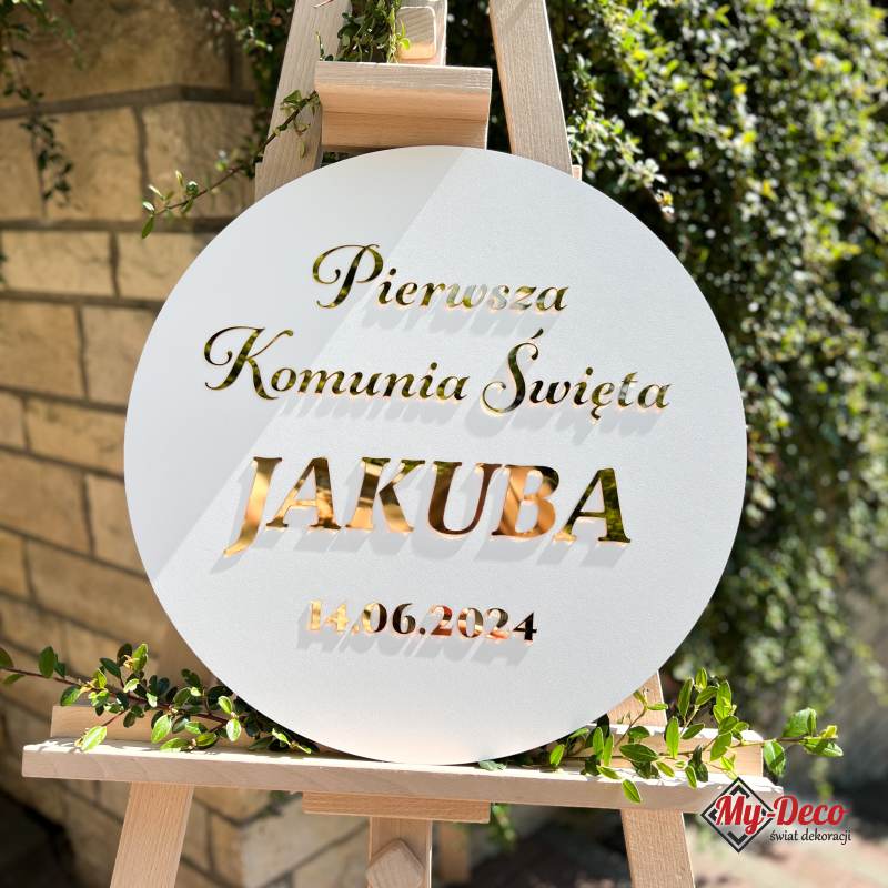 Tablica Powitalna na Komunię — Blask Złotej Pleksi w Kształcie Koła z Personalizacją