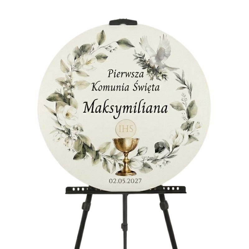 Personalizowana tablica powitalna na Pierwszą Komunię Świętą Powitaj swoich gości w wyjątkowym stylu! Okrągła, sztywna tablica z eleganckim motywem botanicznym (eukaliptus i białe kwiaty) oraz klasycznym złotym akcentem IHS to idealna dekoracja przed wejście lub ścianka do zdjęć.