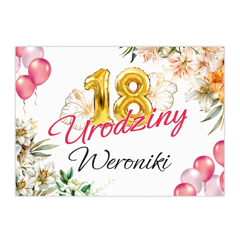 Tablica powitalna z imieniem na urodziny z kolorowym nadrukiem UV, wykonana z trwałego PCV (50×70 cm). Idealna na 18, 30, 40, 50, 60 urodziny.