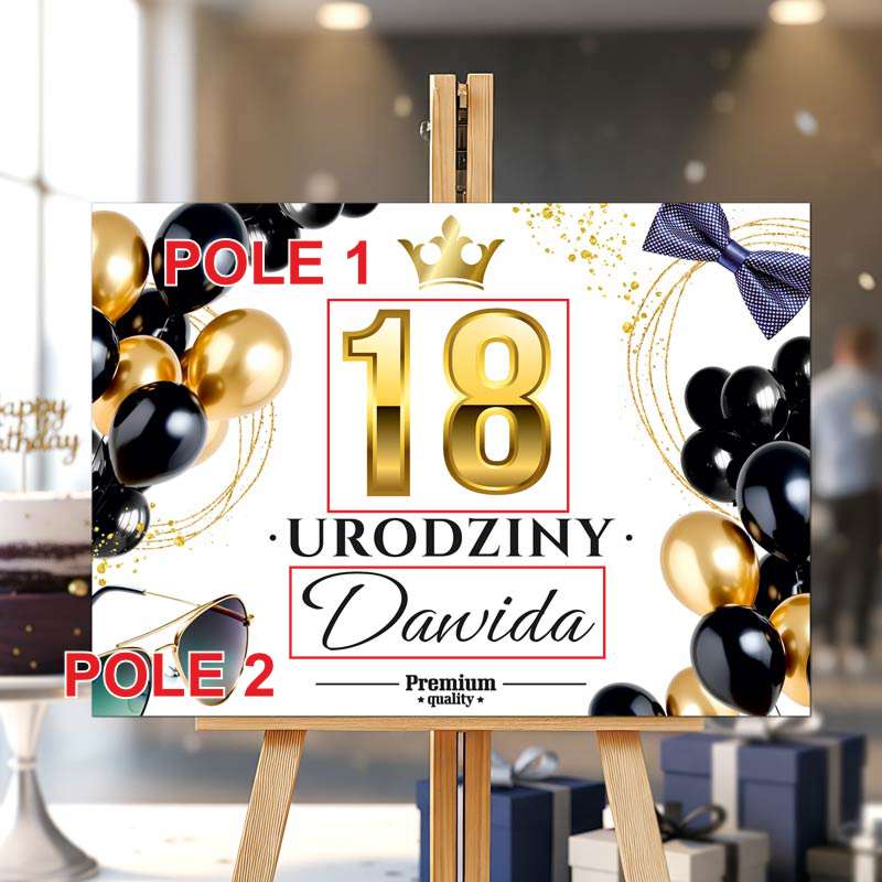 Czerń i złoto to symbol luksusu i stylowego wykonania. Idealnie pasują na uroczystość osiemnastki. Ta elegancka paleta sprawia, że plansza urodzinowa jest wytworna i nowoczesna. Staje się centralnym punktem dekoracji. Złote detale podkreślają wyjątkowość momentu. Czarne tło dodaje klasy. Ta duża tablica urodzinowa dla gości łatwo dopasowuje się do innych dekoracji. Jest praktyczna i piękna. Goście chętnie zrobią przy niej zdjęcia. Nadruk na PCV sprawia, że złoto lśni. Jeśli szukasz trwałej i olśniewającej ozdoby powitalnej, ten plakat powitalny urodzinowy jest dla Ciebie. Wybierz jakość z my-deco.pl.