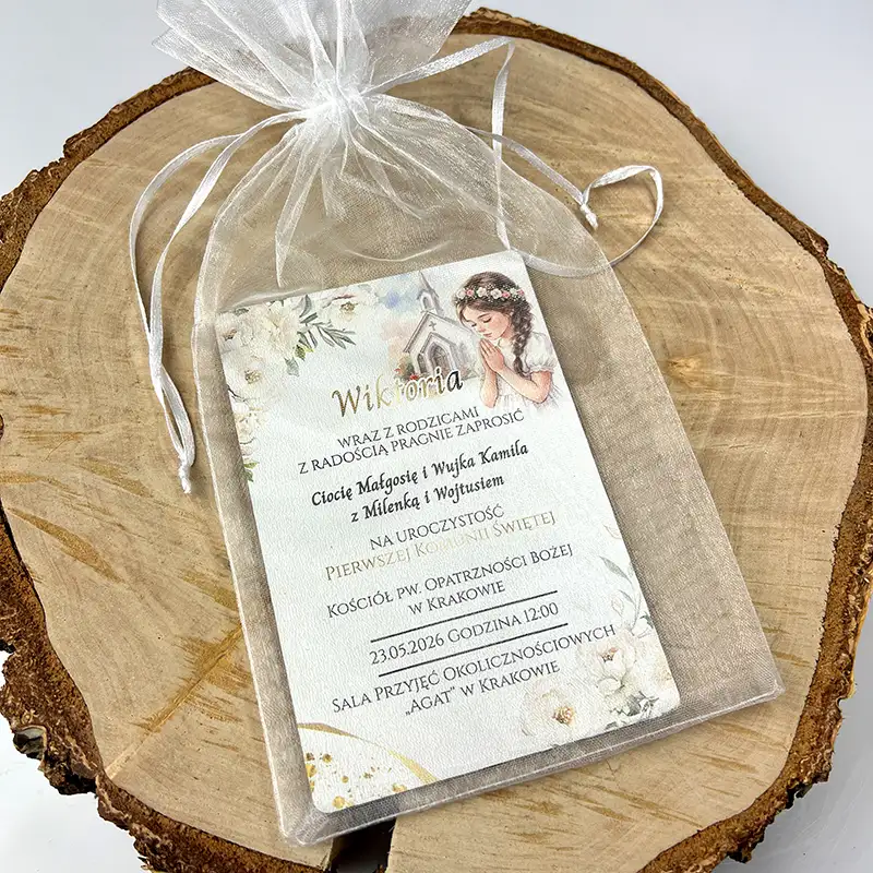 Zapomnij o nietrwałym papierze. Wybierz zaproszenia na komunię z białej płyty HDF z kolorowym nadrukiem, które zachwycają sztywnością i luksusowym wyglądem. W naszym sklepie każda sztuka jest unikatowa. Imię dziecka, data Komunii oraz dedykacja są dopasowywane indywidualnie do Twoich potrzeb. To idealna pamiątka, która nie wygina się i zachowuje formę przez lata. Nasze produkty to zaprzeczenie masowej produkcji – tworzymy je na Twoje zamówienie z najwyższą dbałością o detale.