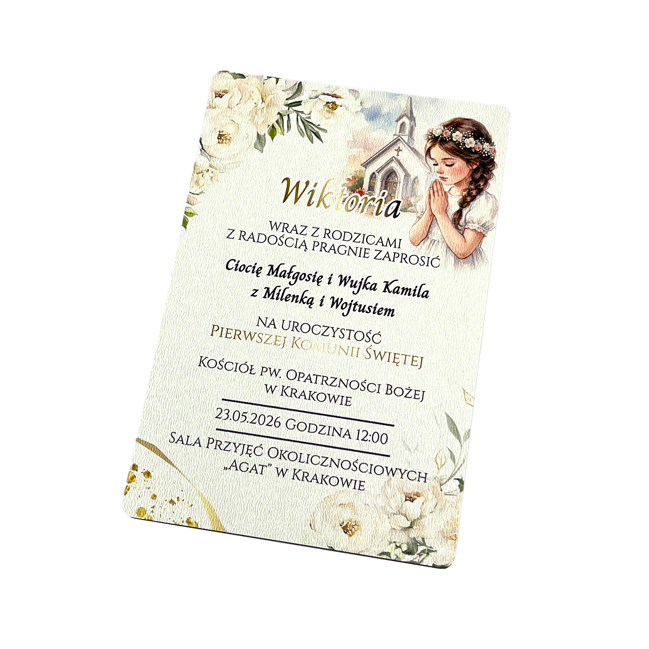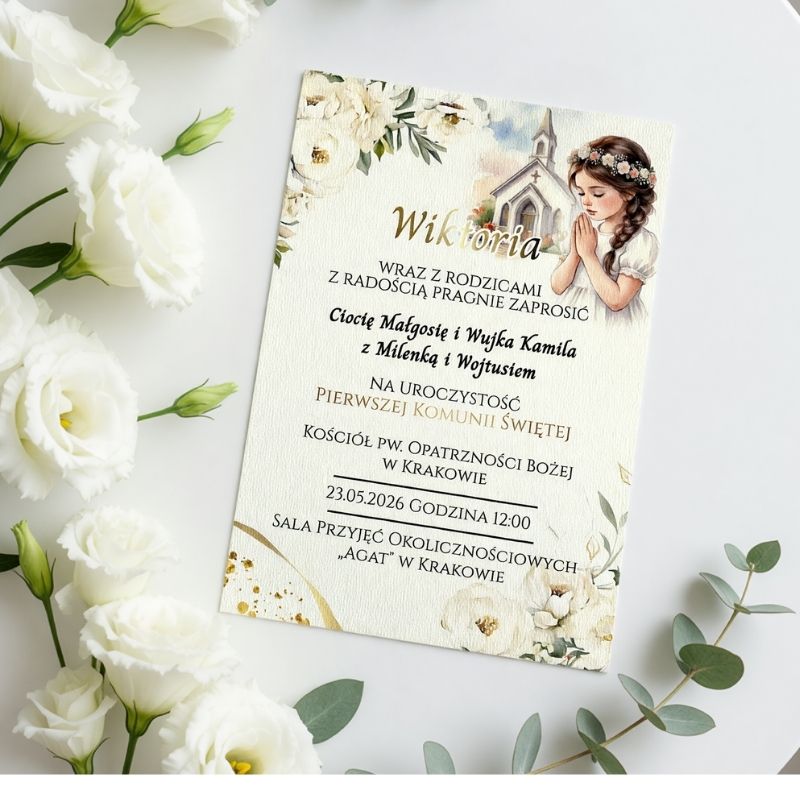 Szukasz wzoru, który łączy symbole religijne z naturą? Na zaproszeniu widnieje grafika modlącej się dziewczynki oraz sylwetka kościoła. Całość zdobią delikatne, białe kwiaty eustomy oraz zielone dodatki. Dzięki technologii UV nadruk jest wyraźny i trwały.