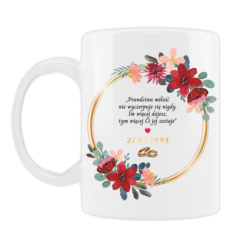 Każdy poranek spędzony z ulubioną kawą lub herbata staje się wyjątkowym momentem, pełnym wspomnień i ciepłych myśli. Kubki ozdobione kolorową grafiką z motywem kwiatów wnoszą radość do każdego dnia, a ich elegancki wygląd sprawia, że stają się piękną ozdobą stołu. Wykorzystana technologia druku sublimacyjnego gwarantuje trwałość kolorów, dzięki czemu kubki nie stracą na intensywności przez wiele lat. Na odwrocie każdego kubka znajduje się wzruszający wierszyk, który w subtelny sposób przypomina o sile miłości i pięknie wspólnie spędzonych chwil. Kubki o pojemności 330 ml doskonale sprawdzają się jako towarzysz codziennych rytuałów – zarówno porannej kawy, jak i popołudniowej herbaty.