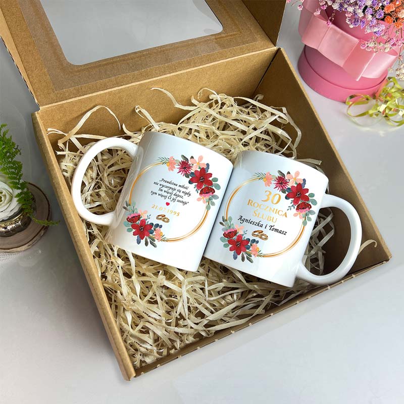 Każdy zestaw kubków na rocznicę ślubu jest nie tylko starannie wykonany, ale również elegancko zapakowany, dzięki czemu jest gotowy do wręczenia jako prezent. Kubki umieszczone są w ozdobnym pudełku z okienkiem, które pozwala od razu podziwiać ich piękne wykonanie. Wnętrze pudełka wypełnione jest dekoracyjną wełną drewnianą, co dodaje naturalnego uroku i podkreśla elegancję prezentu. Dzięki temu zestaw od razu nadaje się do wręczenia, bez potrzeby dodatkowego pakowania.